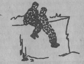 Рис 4 следует идти до полного изнеможения. Привалы делаются через равные промежутки времени. При движении по дюнам, если нет троп и дорог, надо двигаться вдоль их подножия, там грунт плотнее. При движении по песку рекомендуется идти коротким шагом / не более 50 см/, ставить ногу на всю ступню, не разгибая полностью колена; этим достигается эластичность шага, экономия сил, ноги меньше вязнут в песке. В некоторых районах, особенно на побережьях морей, вблизи рек и озер, можно встретить зыбучие пески, перенасыщенные снизу водой, которые при движении по ним ведут себя как болота. Если, попав в такое место, вы начнете проваливаться, нужно упасть навзничь, положить руки на 'песок, откатиться в сторону и отползти на твердую почву. Не следует делать резких панических движений, так как песок разбрасывается и человека постепенно, а иногда и очень быстро засасывает. Крайне сложен переход в зимнее время, когда снежный покров глубок и не выдерживает веса человека. Преодолеть заснеженные участки без лыж практически невозможно. Движение на лыжах в зависимости от обстановки, местности в погоды осуществляется с палками /всеми существующими способами/ или без палок. Груз и экипировку необходимо разместить равномерно на спине и груди так, чтобы она не стесняла движение. Руки, если движение осуществляется без палок, должны быть свободными. При отсутствии настоящих лыж, можно изготовить лыжи-снегоступы. Такие лыжи при известной сноровке изготавливают в виде рамы - из двух ветвей толщиной 2 - 2,5 см и длиной 140 - 150 см. Передний конец лыжи, распарив в горячей воде, загибают к верху, а раму / ширина в центре не менее 30 см/ заплетают тонкими гибкими ветвями. В центре лыжи из четырех поперечных и двух продольных планок делают опору для ног по размеру обуви. Рис 5. Зимой можно передвигаться по руслам замерзших рек, соблюдая при этом необходимые меры предосторожности. Все препятствия на речном льду лучше обходить, в местах изгибов рек надо держаться подальше от обрывистого берега, где течение быстрее и лед поэтому тоньше. По льду, который кажется недостаточно прочным, а другого пути нет, передвигаются ползком. При движении по болоту необходимо соблюдать особую осторожность. Если имеется такая возможность, то лучше обойти лежащее на пути болото. В противном случае к переходу необходимо подготовиться заранее. Следует из тонкого деревца вырубить слегу /шест длиной до трех метров и толщиной до 5 см/. Подготовить кусок веревки с грузиком на конце. Передвигаться следует ближе к растущим на болоте деревьям. В случае частного расположения кочек можно передвигаться по кочкам, но следует учитывать, что кочки могут быть не твердыми, поэтому ногу на них надо ставить осторожно, опираясь руками на слегу. При движении по чистой воде или зыбкой почве необходимо, прежде чем поставить ногу, опробовать твердость грунта слегой. Если вы провалитесь, не паникуйте и не делайте резких движений. Попытайтесь лечь, расставив руки в стороны и опираясь на положенную поперек слегу, затем попытайтесь спокойно выползти на твердую почву. Может помочь вам выбраться из подобного положения веревка с грузиком на конце. Ее необходимо забросить на ближайшее дерево таким образом, чтобы грузик обмотал толстую ветку или ствол веревкой на несколь-