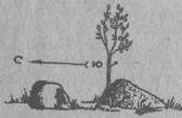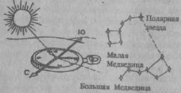 стей сустава. Их легко определяют по резкой болезненности сустава и полной невозможности производить в нем движение. Обычно при этом изменяется внешняя форма сустава: головка смещенной кости образует уступ, а на ее обычном месте оказывается впадина. Вся конечность принимает вынужденное, неправильное положение. Если никто из окружающих не умеет вправлять вывих, следует ограничиться тугой фиксирующей повязкой. Растяжение связок определяют по острой боли в момент повреждения, появлению равномерной опухоли и, наконец, болезненности и ограниченности движения в суставе. Лучшая помощь при растяжении - тугая повязка и холод. При ожогах /любой степени/ необходимо протереть пораженное место спиртом или одеколоном и наложить асептическую повязку с противоожоговой жидкостью или синтомициновой эмульсией. При ожогах 3 и 4 степеней помимо указанной выше помощи, пострадавшему дается обильное питье и обезболивающие препараты /промедол и т.п./. Это далеко не весь перечень болезней и травм, которые могут подстерегать вас, когда вы находитесь один на один с природой. И советы на все случаи жизни дать, практически, невозможно. Однако, чем больше вы будете знать об оказании само- и взаимопомощи, тем менее неожиданным и опасным для вас будет любой недуг. Где бы не оказался человек /на суше или океане, в джунглях или пустыне/, решил ли оставаться на месте или двинуться в путь, он в первую очередь должен сориентироваться, определить свое местонахождение. По компасу определить стороны света не сложно, но при его отсутствии можно прибегнуть к помощи природных указателей. В полдень, в северном полушарии, став спиной к солнцу север будет по направлению тени отброшенной вашим телом. При этом запад будет по левую руку, а восток по правую. В южном полушарии все наооборот: тень ляжет на юг, запад будет справа, восток - слева. Если положить часы на горизонтальную поверхность и поворачивать их до тех пор, пока часовая стрелка не будет направлена в сторону солнца, а затем через центр циферблата на цифру 1/13/ мысленно провести прямую линию /А/, то биссектриса угла, образованного ею и часовой стрелкой, пройдет с севера на юг. В ночное время в северном полушарии легче всего сориентироваться по Полярной звезде, отыскать ее помогает созвездие Большая Медведица. В южном полушарии обычно ориентируются по созвездию Южный Крест - четырем ярким звездам, расположенным в форме креста. Направление на юг определяют по линии /А/, мысленно проведенной через длинную ось Креста.