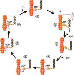 Рис. 5. Цикл структурных превращений актино-миозинового комплекса, приводящих к смещению молекулы миозина вдоль нити актина