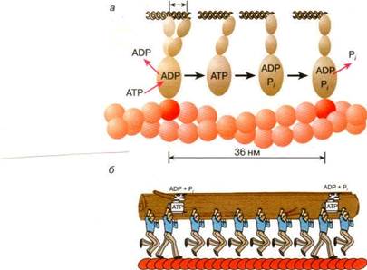 Рис. 5. Схема перемещения молекулы миозина вдоль нити актина Двигаясь вдоль нити актина цитоскелета, молекула-переносчик может тащить за собой органоид, к которой она прикрепляется своим хвостом. Таким способом молекулы миозина осуществляют перенос различных частиц и органоидов в клетке. Движение органоидов при помощи белков-переносчиков хорошо исследована в гигантских клетках зеленой водоросли Nitella. На периферии клетки, рядом с плазматической мембраной, находится слой хлоропластов. Хлоропласты примыкают к так называемому кортикальному слою, который содержит пучки актиновых нитей. Между неподвижными кортикальным слоем и мембраной вакуоли расположен слой движущейся цитоплазмы, в котором находятся ядра, митохондрии и другие органеллы. Молекулы миозина совершают круговое движения внутри клетки, равномерно перемещаясь вдоль нитей актина и увлекая за собой сравнительно крупные органеллы (митохондрии, эндоплазматический ретикулум, ядра и др.). Скорость перемещения органелл составляет 50-75 мкм/с. Благодаря такому движению в гигантской клетке водоросли возникает циркуляция цитоплазмы, за счет которой ее содержимое перемешивается гораздо быстрее, чем это происходило бы путем простой диффузии. Гигантские клетки зеленых водорослей достигают длины 2-5 см, поэтому без принудительной циркуляции цитоплазмы молекулам белков потребовалось бы около 10 суток для диффузии с одного конца клетки на другой. Пока не разгадан механизм движения хлоропластов в цитоплазме клеток водорослей и высших растений. Известно, что при освещении растений хлоропласты быстро перемещаются внутри клетки, собираясь вблизи клеточной стенки. Хлоропласты зеленой водоросли Chara могут часами вращаться (один оборот за 2-3 с) в одном и том же направлении в капле протоплазмы, выдавленной из клетки. В работах В.П. Скулачева с сотрудниками показано, что вращение хлоропластов - это энергозависимый процесс, который поддерживается за счет протонного потенциала. Однако, механизмы использования энергии мембранного потенциала для движения хлоропластов пока неизвестны. Хорошо изученным из внутриклеточных двигательных белков являются молекулы кинезинового типа. Кинезин в животных клетках выполняет функцию переносчика различных органоидов (митохондрии, лизозомы) и внутриклеточных частиц. В клетках дрожжей найдено шесть белков, похожих на кинезин. В клетках мышей обнаружено более двух десятков подобных белков. Двигаясь вдоль микротрубочек (рис. 6), молекула кинезина может тянуть за собой сравнительно крупные субклеточные частицы.