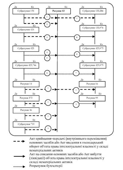 казом) керівника підприємства (організації). Акт (накладна), після його оформлення, з прикладеною технічною документацією, що відноситься до даного об'єкта, передається до бухгалтерії підприємства, підписується головним бухгалтером та затверджується керівником підприємства, організації чи особами, на те уповноваженими. До акту додається копія охоронного документа, також документи, що описують сам об'єкт або порядок його використання. При отриманні підприємством "ноу-хау" також додається аудіо-, відео-, або письмове відображення змісту конфіденційної інформації, що є об'єктом угоди. Для оформлення вибуття окремих об'єктів нематеріальних активів при повній їх ліквідації застосовують форму №ОЗ-3 або НА-3. Форма застосовується для оформлення вибуття нематеріальних активів при повному або частковому їх списанні. Акт складається у двох примірниках комісією, призначеною керівником підприємства, будови, організації, затверджується керівником підприємства (організації) або особою, на те уповноваженою. Для обліку наявності нематеріальних активів на підприємстві та нарахування амортизації за ними призначена форма № ВНА-1 "Відомість обліку нематеріальних активів і нарахування амортизації". Крім того, слід зазначити, що більшість нематеріальних активів є об'єктами цивільного обігу і їхня передача (відчуження) здійснюється здебільшого на підставі ліцензійних угод. Ці угоди обов'язково додаються до первинних документів, при надходженні і вибутті нематеріальних активів. Синтетичний і аналітичний облік нематеріальних активів Узагальнення інформації про наявність та рух нематеріальних активів і їх знос відбувається в Журналі ордері №4. Міністерством фінансів України запропоновано для ведення аналітичного обліку операцій з нематеріальними активами Відомість 4.3 аналітичного обліку нематеріальних активів (наказ від 29.12.2000р. №356). Аналітичний облік ведеться за кожним об'єктом окремо в картках обліку для об'єктів права інтелектуальної власності за формою №НА-2 "Інвентарна картка обліку об'єкта права інтелектуальної власності у складі нематеріальних активів" для інших нематеріальних активів за формою ОЗ-9 "Інвентарна картка обліку основних засобів". Картка заповнюється в одному примірнику на основі "Акта (накладної) приймання-передачі, технічної та іншої документації". В картку вноситься вся інформація, про об'єкт і зміни, що з ним відбуваються. Підставою для відміток про вибуття об'єктів нематеріальних активів при передачі їх іншому підприємству (організації), а також про переміщення в середині підприємства є Акт (накладна) приймання-передачі при списанні об'єкта нематеріальних активів внаслідок старіння чи зносу - "Акт на списання основних засобів" (форма N 03-3). Синтетичний облік нематеріальних активів ведеться на рахунку 12 "Нематеріальні активи" за первинною вартістю, яка визначається за об'єктами. Використовуються субрахунки: 121 "Права користування природними ресурсами"; 122 "Права користування майном"; 123 "Права на комерційні позначення"; 124 "Права на об'єкти промислової власності"; 125 "Авторське право та суміжні з ним права"; 127 "Інші нематеріальні активи". По дебету рахунка 12 "Нематеріальні активи" та його субрахунків ведуть облік надходження (придбання, виготовлення, безоплатне одержання від інших юридичних осіб) нематеріальних