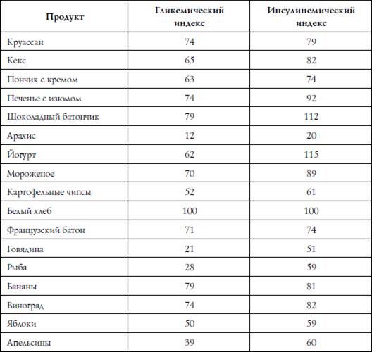 Результаты проведенного исследования показали, что участники, потреблявшие продукты с низким ГИ, имели уровни гормона GLP‑1 в плазме крови на 20 % выше, а этот гормон является самым эффективным химическим веществом для подавления аппетита. Таким образом, продукты с низким ГИ позволяют человеку значительно уменьшить количество потребляемой пищи и не страдать при этом от голода. Показатели уровня инсулина в этой группе также были на 38 % ниже по сравнению с показателями тех, кто употреблял пищу с высоким ГИ. Лондонским специалистам впервые удалось проиллюстрировать влияние различной еды на производство GLP‑1 и формирование эффекта насыщения. И уже относительно недавно Жанетт Брэнд‑Миллер (Janette Brand‑Miller) из Сиднейского университета, проводя исследования, обратила внимание на то, что в ответ на употребление некоторых видов продуктов с низким ГИ поджелудочная железа иногда почему‑то выделяет слишком много инсулина. Итогом ее работы стало введение нового индекса. В дополнение к ГИ, который характеризует скорость повышения уровня глюкозы в крови, она предложила новый индекс – инсулинемический, который характеризует скорость выделения инсулина в ответ на ту или иную пищу. Этот показатель более точно отражает способность продуктов питания влиять на выделение инсулина. К тому же оказалось, что в большинстве случаев оба эти индекса соответствуют друг другу – чем больше один, тем больше и другой. В большинстве случаев, но не всегда! Раньше предполагалось, что гликемический индекс характеризует скорость подъема уровня сахара в крови в ответ на потребление определенного количества (порции) любого продукта, содержащего в своем составе 50 г чистых углеводов. Жанетт Брэнд‑Миллер предложила пересмотреть этот подход: • за продукт для сравнения (эталон) она взяла не глюкозу, а белый хлеб. Его гликемический индекс условно принимался ею за 100 единиц; • для экспериментов и дальнейших вычислений как инсулинемического, так и гликемического индексов предлагалось использовать не эталонные порции продукта, содержащие 50 г углеводов, а порции продуктов, дающие при сгорании одинаковое количество энергии: 1000 килоджоулей (240 ккал).
