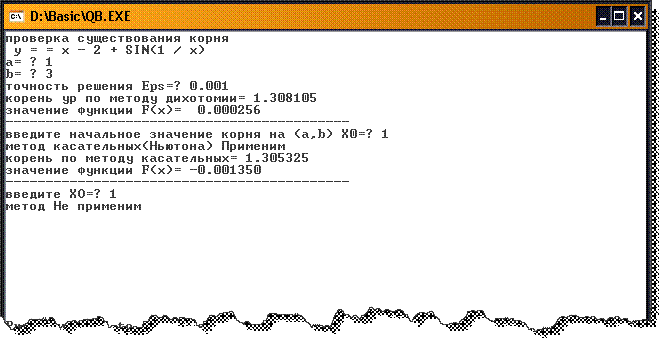 ВИД ПРОГРАММЫ НА ЯЗЫКЕ QBASIC DECLARE SUB iter (x0!, e!, kol!, root!) DECLARE SUB iter (x0!, e!, kol!, root!) DECLARE SUB dix (a!, b!, e!, root!) DECLARE SUB kas (a!, b!, x!, e!, root!) DECLARE FUNCTION F! (x!) DECLARE FUNCTION G! (x!) DECLARE FUNCTION F1! (x!) DECLARE FUNCTION F2! (x!) DECLARE FUNCTION G2! (x!) REM численное решение не линейных уравнений 'уточнение корня методами касательных/дихот/ньютона/итерации CLS PRINT "проверка существования корня" PRINT " y = = x - 2 + SIN(1 / x)" REM ввод отрезка с проверкой на сущ решения DO INPUT "a= "; a INPUT "b= "; b INPUT "точность решения Eps="; e LOOP WHILE F(a) * F(b) > 0 REM мет дихотомии или метод деления отрезка пополам CALL dix(a, b, e, root) PRINT "корень ур по методу дихотомии="; root PRINT "значение функции F(x)="; PRINT USING " ##.######"; F(root) PRINT "-------------------------------------------" REM метод касательных или метод Ньютона INPUT "введите начальное значение корня на (a,b) X0="; x IF F(x) * F2(x) > 0 THEN PRINT "метод касательных(Ньютона) Применим" a = 1: b = 3 CALL kas(a, b, x, e, root) PRINT "корень по методу касательных="; root PRINT "значение функции F(x)="; PRINT USING " ##.######"; F(root) ELSE PRINT "метод касательных(Ньютона) НЕ Применим" END IF PRINT "-------------------------------------------" REM метод итерации INPUT "введите XO="; x0 IF ABS(G1(x)) < 1 THEN PRINT "метод Не применим" ELSE a = 1: b = 3 CALL iter(x0, e, kol, root) PRINT "корень по методу итерации="; root PRINT " количество итераций k="; kol PRINT "значение функции F(x)="; PRINT USING " ##.######"; F(root) END IF END