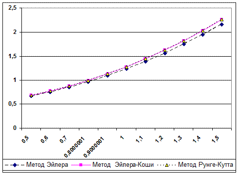REM Вызов Метода Эйлера-Коши CALL koshi(a, b, h, yy) yy = y0 REM Вызов Метода Рунге-Кутта CALL runge(a, b, h, yy) PRINT "--------------------------------------------------------------" PRINT "│ x │ elier │ koshi │ runge │" PRINT "--------------------------------------------------------------" L$ = "│ #.# │ ##.##### │ ##.##### │ ##.##### │" i = 1 FOR x = a TO b + h / 2 STEP h PRINT USING L$; x; eilerM(i); koshiM(i); rungeM(i) i = i + 1 NEXT x PRINT "--------------------------------------------------------------" END Первые четыре строчки пишутся автоматически при присоединении подпрограмм к головному модулю в результате выполнения команды Save All. Подпрограмма для решения дифференциального уравнения i = 1 eilerM(i) = y0 FOR x = a TO b + h / 2 STEP h y = y0 + h * f(x, y0) y0 = y i = i + 1 eilerM(i) = y0 NEXT x Подпрограмма для решения дифференциального уравнения i = 1 koshiM(i) = y0 FOR x = a TO b + h / 2 STEP h k1 = h * f(x, y0) k2 = h * f(x + h, y0 + k1) y = y0 + (k1 + k2) / 2 y0 = y i = i + 1 koshiM(i) = y0 NEXT x Подпрограмма для решения дифференциального уравнения i = 1 rungeM(i) = y0 FOR x = a TO b + h / 2 STEP h k1 = h * f(x, y0) k2 = h * f(x + h / 2, y0 + k1 / 2) k3 = h * f(x + h / 2, y0 + k2 / 2) k4 = h * f(x + h, y0 + k3) y = y0 + (k1 + 2 * k2 + 2 * k3 + k4) / 6 y0 = y i = i + 1 rungeM(i) = y0 NEXT x Процедура функция: f = < функция соответствующего варианта > 1. Для построения графика в Excel следует: 2. Набить таблицу значений из Qbasic (в каждом столбце результат решения дифференциального уравнения соответствующим методом).
