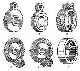 Рис. 1.2. Основные виды зубчатых передач: а – прямозубая зубчатая передача; б – косозубая зубчатая передача; в – шевронная передача; г и д –передача с коническими колесами, прямыми и круговыми зубьями; е – прямозубая с внутренним зацеплением