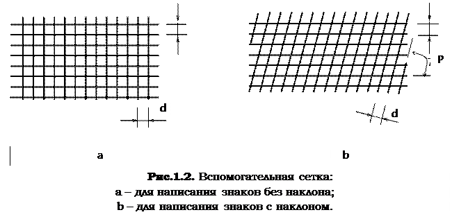Вспомогательная сетка - сетка, образованная вспомогательными линиями, в которые вписываются буквы. Шаг вспомогательных линий сетки определяется в зависимости от толщины линий шрифта d (рис. 1.2).