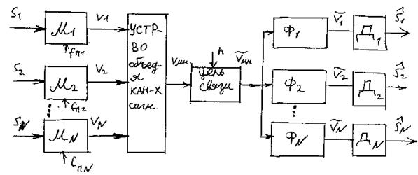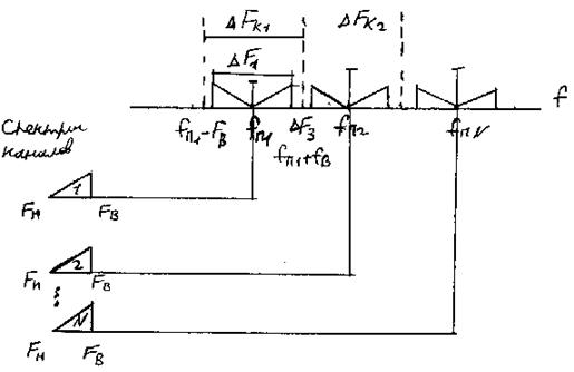 Модулируя поднесущее колебание можно получить N канальных сигналов, каждый из которых занимает полосу частот ΔFi, которое зависит от ширины спектра исходящего сообщения Xi(t) и вида модуляции. Чтобы уменьшить взаимное влияние между каналами и облегчить их разделение, между ними вводятся защитные промежутки ΔFзi.