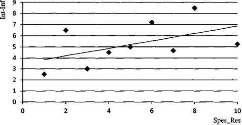 Рис. 4. Зависимость интенсивности информационного обмена от специфичности актива 1 Miles R., Snow C. Network organizations: New concepts for new forms // California Management Review. 1986. Vol. 28. N 3. P. 62 - 73. стр. 127 Здесь: Int-Inf - средневзвешенные значения интенсивности информационного обмена по каждому уровню специфичности ресурса; интенсивность информационного обмена оценивалась экспертами по 10-балльной шкале (1 соответствует слабому информационному обмену, когда всей необходимой информацией, в том числе и текущей, обладают работники предприятия; 10 - сильному, когда значительный объем необходимой информации предоставляется партнером). Кроме того, по мере роста специфичности актива увеличивается стратегический уровень передаваемой информации (r = 0,69).