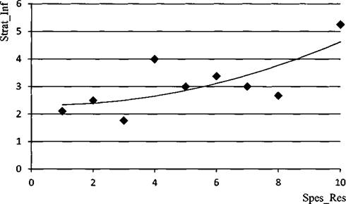 Рис. 5. Зависимость стратегического уровня передаваемой информации от специфичности актива Здесь: Strat-Inf - средневзвешенные значения стратегического уровня передаваемой информации по каждому уровню специфичности ресурса; стратегический уровень передаваемой информации оценивался по 10-балльной шкале через призму возможного ущерба в случае "утечки" информации, переданной партнеру, за пределы компаний (1 низкий уровень, так как партнеру предоставляется только самая общая информация, публикуемая в официальных источниках для широкого пользования; 10 - очень высокий, так как передаваемая информация носит стратегический характер). Поскольку обмен информацией, особенно в условиях, когда она носит стратегический характер, связан с определенными рисками, возникает повышенное требование к качеству технических коммуникаций стр. 128 (связь, ИТ, техническое обеспечение поддерживающих услуг и пр.) с партнерами. Результаты исследования подтверждают данные выводы: с ростом специфичности актива и, как результат, стратегического уровня передаваемой информации растет неудовлетворенность качеством традиционных технических коммуникаций (r = -0,68), что обуславливает необходимость увеличения затрат на обеспечение информационной безопасности (рис. 6).