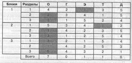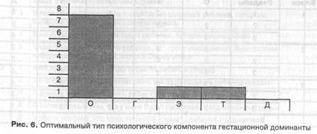 В нижней строке таблицы — «Всего» — выставляется результат подсчета количества отмеченных цифр (баллов, не суммы цифр!) в каждом столбце. Столбец «О» отражает утверждения, характеризующие преимущественно оптимальный тип ПКГД, «Г» — гипогестогнозический, «Э» — эйфорический, «Т» — тревожный, «Д» — депрессивный. Если в результате тестирования набрано 7—9 баллов, соответствующих одному из типов ПКГД, он может считаться определяющим. Если ни по какому типу ПКГД преобладания баллов не наблюдается, нетрудно определить, какие подсистемы ПКГД у женщины нуждаются в коррекции. Для наглядности можно построить профиль ПКГД в виде гистограммы. По вертикали отмечаются избранные баллы, а по горизонтали — типы ПКГТ (рис. 6).