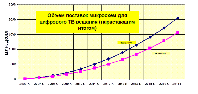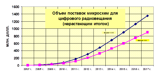 Расчет объема поставок микросхем в денежном выражении (млн. долл.), связанных только с переходом на выпуск цифровых радиоприемников приведен на рис. 2.