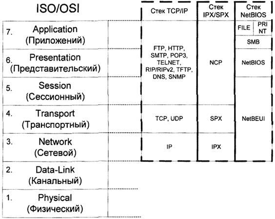 Рис. 10.2. Модель ISO/OSI и стек TCP/IP.
