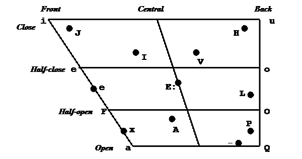 Vowels /'vaVqlz/ are sounds in which there is no obstruction to the flow of air as it passes from the larynx to the lips. They differ from each other in several ways. We need a very accurate way of classifying the vowels. Phoneticians have developed a set of vowels, arranged in a diagram, which are not the vowels of any particular language. These are cardinal vowels which represent the extreme points of vowel quality that the human organs of speech can make. It is traditional to describe vowels of any language by comparing them with these cardinal vowels (see Figure 3). Figure 3. Vowels.
