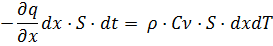За время dt в стержень через левую грань поступает количество тепла R q(x) · S ·dt (1) За это время через правую грань уходит количество тепла q(x + dx) · S · dt (2) В (1) и (2): q – плотность потока тепла [q] – Дж/м2·с; S – площадь сечения стержня [S] – м2 [q· S·dt] = Дж/м2·с ·м2·с = Дж Пусть q = 5Дж/м2·с Согласно уравнению теплового баланса: [q(x) – q(x + dx)]·S·dt = dQ (3) Здесь dQ – изменение количества тепла в стержне за время dt/ dQ = m· Cν ·dT = ρ ·dx ·S · Cν·dT (4) В (4) m = ρ · dx ·S m – масса участка стержня длины dx, Сν – удельная теплоемкость [dQ] = кг/м3·м·м2·Дж/ кг·К = Дж По определению производной функции в левой части (3) q = (x + dx) – q(x) =