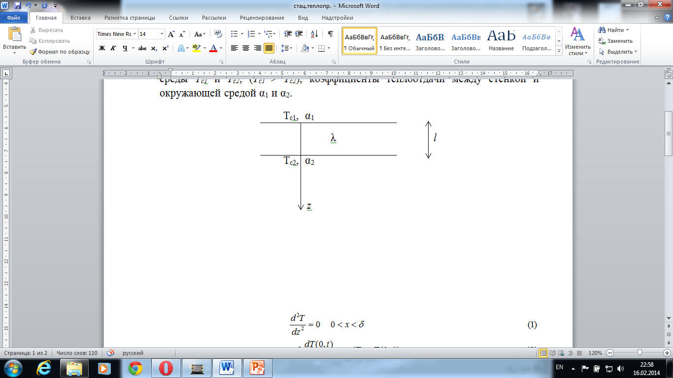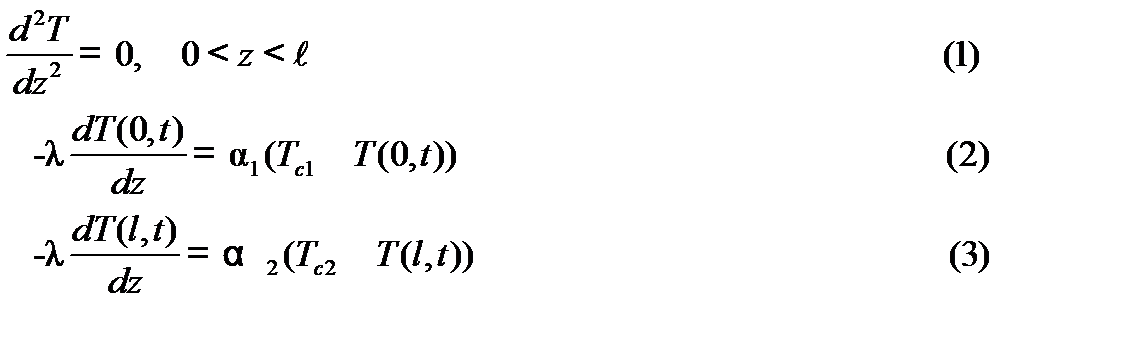 Физическая постановка задачи. Задана: Теплопроводность и толщина стенки λ и l; температуры окружающей среды Тс1 и Тс2, (Тс1 > Тс2), коэффициенты теплоотдачи между стенкой и окружающей средой α1 и α2. Через стенку в направлении оси z происходит перенос тепла. Необходимо найти распределение температуры в стенке и тепловой поток через нее.