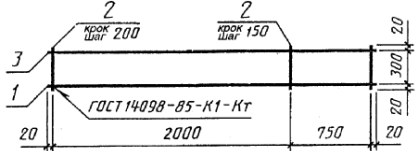 Рисунок 7 ДСТУ Б А.2.4-7-95 (ГОСТ 21.501 -93) с.12 е) при зображенні каркасу або сітки однакові стержні, розміщені на рівних відстанях, наносять тільки по кінцях каркасу або сітки, а також в місцях зміни кроку стержнів. При цьому під полицею лінії - виноски з позначенням позиції стержня вказують їх крок згідно з рисунком 8; е) при изображении каркаса или сетки одинаковые стержни, расположенные на равных расстояниях, наносят только по концам каркаса или сетки, а также в местах изменения шага стержней. При этом под полкой линии - выноски с обозначением позиции стержня указывают их шаг в соответствии с рисунком 8;