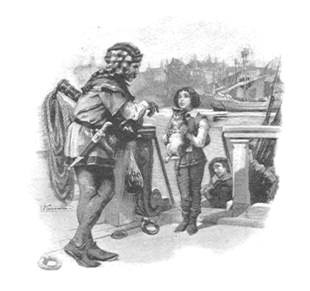 II. THE KITCHEN By and by Dick grew so faint and tired that he could go no farther. He sat down by the door of a fine house, and wished that he was back again in the little town where he was born. The cook-maid, who was just getting dinner, saw him, and called out,— "What are you doing there, you little beggar? If you don't get away quick, I'll throw a panful of hot dish-water over you. Then I guess you will jump." [143] Just at that time the master of the house, whose name was Mr. Fitzwarren, came home to dinner. When he saw the ragged little fellow at his door, he said,— "My lad, what are you doing here? I am afraid you are a lazy fellow, and that you want to live without work." "No, indeed!" said Dick. "I would like to work, if I could find anything to do. But I do not know anybody in this town, and I have not had anything to eat for a long time." "Poor little fellow!" said Mr. Fitzwarren. "Come in, and I will see what I can do for you." And he ordered the cook to give the lad a good dinner, and then to find some light work for him to do. Little Dick would have been very happy in the new home which he had thus found, if it had not been for the cross cook. She would often say,— "You are my boy now, and so you must do as I tell you. Look sharp there! Make the fires, carry out the ashes, wash these dishes, sweep the floor, bring in the wood! Oh, what a lazy fellow you are!" And then she would box his ears, or beat him with the broomstick. At last, little Alice, his master's daughter, saw how he was treated, and she told the cook she would be turned off if she was not kinder to the [144] lad. After that, Dick had an easier time of it; but his troubles were not over yet, by any means. His bed was in a garret at the top of the house, far away from the rooms where the other people slept. There were many holes in the floor and walls, and every night a great number of rats and mice came in. They tormented Dick so much, that he did not know what to do. One day a gentleman gave him a penny for cleaning his shoes, and he made up his mind that he would buy a cat with it. The very next morning he met a girl who was carrying a cat in her arms. "I will give you a penny for that cat," he said. "All right," the girl said. "You may have her, and you will find that she is a good mouser too." Dick hid his cat in the garret, and every day he carried a part of his dinner to her. It was not long before she had driven all the rats and mice away; and then Dick could sleep soundly every night. Some time after that, a ship that belonged to Mr. Fitzwarren was about to start on a voyage across the sea. It was loaded with goods which [145] were to be sold in lands far away. Mr. Fitzwarren wanted to give his servants a chance for good fortune too, and so he called all of them into the parlor, and asked if they had anything they would like to send out in the ship for trade. "Every one had something to send,—every one but Dick; and as he had neither money nor goods, he staid in the kitchen, and did not come in with the rest. Little Alice guessed why he did not come, and so she said to her papa,— "Poor Dick ought to have a chance too. Here is some money out of my own purse that you may put in for him." "No, no, my child!" said Mr. Fitzwarren. "He must risk something of his own." And then he called very loud, "Here, Dick! What are you going to send out on the ship?" Dick heard him, and came into the room. "I have nothing in the world," he said, "but a cat which I bought some time ago for a penny." "Fetch your cat, then, my lad," said Mr. Fitzwarren, "and let her go out. Who knows but that she will bring you some profit?" Dick, with tears in his eyes, carried poor puss down to the ship, and gave her to the captain. Everybody laughed at his queer venture; [146] but little Alice felt sorry for him, and gave him money to buy another cat.