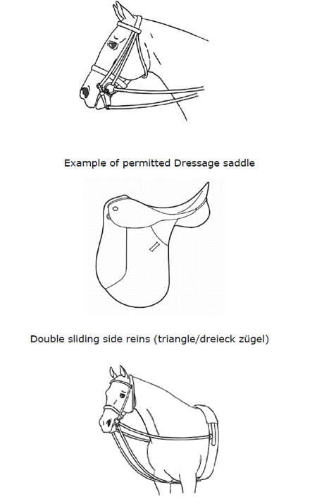 6.1.Обязательны: 6.1.1. Седло для выездки с длинными, почти вертикальными крыльями. 6.1.2. Оголовье с трензелем, мундштуком, цепочкой с резиновым подцепочником в сочетании с простым капсюлем. - Двойное оголовье с мундштуком и цепочкой