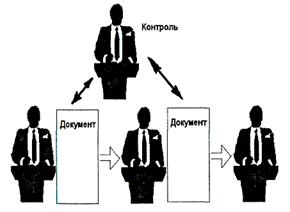 Рис. 9. Функціональна модель використання документа: від одного — до багатьох Можна ускладнювати моделі, збільшуючи кількість документів і виконавців. Однак, як найбільш важливу характеристику документа, виділимо його функціональність, тобто можливість використати один і той же документ у декількох функціях. Ця властивість дозволяє не примножувати кількість видів документів на підприємстві. В той же час саме ця властивість використовується в основній функції системи управління — контролі (рис. 10).