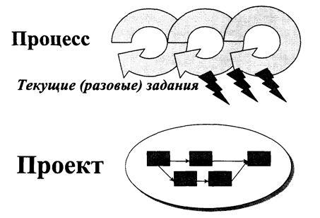 Анализируя работу любой организации, практически всегда можно выделить два основных вида деятельности, которые существуют параллельно: текущие, повторяющиеся процессы (операции) и проекты. Любая деятельность требует ресурсов, выполняется людьми и соответственно требует планирования и контроля. Основными отличиями этих двух видов деятельности является то, что процессы носят повторяющийся, циклический характер, а проекты направлены на достижение уникальных целей в определенные сроки.