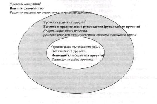 Проекты обычно являются составной частью деятельности более крупных организационных структур. Результаты реализации проектов направлены на достижение целей организаций-заказчиков. Исполнение проекта может осуществляться в рамках одной или нескольких организаций. Таким образом, организационная структура проекта определяется как его целями и содержанием работ, так и структурами организаций, участвующих в проекте. В любом случае концепция и организационная структура проекта должны быть согласованы со стратегическим планом развития организации и структурой организации производства. В организационной структуре проекта могут быть выделены три основных уровня: · Организация на концептуальном уровне. На данном уровне определяются основные принципы взаимодействия и разъясняется степень участия различных участников проекта, определяются взаимоотношения на уровне компаний, отделов и управленческого аппарата. · Организация на уровне стратегии. На данном уровне определяется ответственность за достижение ключевых вех. Организационными элементами здесь могут быть компании, отделы, ключевые менеджеры. · Организация выполнения работ. На данном уровне определяется ответственность за выполнение отдельных работ, назначаются исполнители и поддерживающие ресурсы. Управленческие решения, принимаемые на разных организационных уровнях проекта, требуют участия руководства и исполнителей, занимающих соответствующие ступени в организационной структуре компании (см рис. 3.1.).