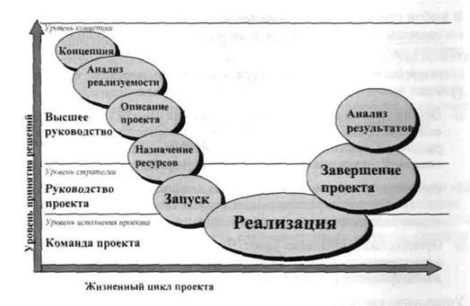 Рис.3.2. Роль различных уровней организационной структуры проекта в принятии решений на разных стадиях проектного цикла. На уровне концептуального планирования и управления проектом основную роль играют руководители высшего звена руководства организации, принимающие решения, касающиеся целей и приоритетов проектов, объемов финансирования и ресурсного обеспечения. Данный уровень управления играет ключевую роль на прединвестиционной стадии проекта, когда принимаются решения относительно проекта в целом. На стадии планирования и запуска проекта управленческие решения касаются стратегии достижения целей проекта и центр руководства перемещается на стратегический организационный уровень. На стадии реализации проекта основная масса управленческих решений касается оперативного планирования, технической реализации и тактики исполнения задач. Главную роль на стадиях исполнения играет организация работы команды проекта.