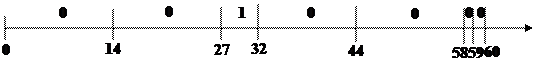 В системе GPSS автоматически собирается статистика по всем устройствам и очередям, для которых заданы блоки QUEUE-DEPART. Для лучшего понимания сути этих статистических характеристик, рассмотрим пример ручного расчета по устройству MASTER и очереди QMASTER в модели парикмахерской из п.5. Будем использовать исходные данных, приведенных в п.2 (интервалы времени между приходами транзактов 14, 13, 17, 15,…; а значения времени обслуживания клиентов18, 12, 14,…). Для данного примера была построена временная диаграмма в п.2 (см. рис.1.4.). Допустим, моделирование прервано в момент времени 60. Тогда рассчитанные в этот момент характеристики объектов будут следующие. Характеристики очереди QMASTER: 1) Общее число входов в очередь равно 4. Каждый транзакт, поступающий в систему, проходит блок QUEUE, т.е. регистрируется в очереди. К моменту модельного времени 60 четыре транзакта пройдут этот блок. 2) Число нулевых входов равно 3. Те транзакты, которым не пришлось ожидать в очереди (т.к. в момент их прихода устройство было свободно), регистрируют выход из очереди через блок DEPART в тот же момент времени, когда они прошли блок QUEUE. Такие транзакты называются нулевыми входами в очередь. В нашем примере из 4 зарегистрированных в очереди транзактов три были нулевыми входами (первый, третий и четвертый). 3) Максимальное количество транзактов в очереди равно 1. Следует отметить, что система GPSS никогда не даст значение этой величины, меньшее 1. Даже тот транзакт, который не стоял фактически в очереди, в ней зарегистрирован. Если представить ситуацию, что ни один транзакт не ожидал в очереди (все были нулевыми входами), система все равно даст значение этого показателя, равное 1. Если же в процессе моделирования возникает ситуация одновременного прихода одного транзакта и освобождения устройства другим транзактом, то в силу последовательности обработки цепей событий в очереди может оказаться зарегистрировано на 1 больше транзактов, чем там действительно находилось. Таким образом, иногда система GPSS дает значение показателя “максимальное количество транзактов в очереди”, завышенное на 1. 4) Среднее значение количества транзактов в очереди равно 0,083. Для расчета этой величины нарисуем ось модельного времени до момента окончания моделирования (60) и отметим на ней количество транзактов, находившихся в очереди в течение каждого интервала времени (см. рис.1.7.). Найдем сумму всех временных интервалов, в которые наблюдалось одно и то же значение количества транзактов в очереди. 0 транзактов: (14-0)+(27-14)+(44-32)+(58-44)+(59-58)+(60-59)=55 1 транзакт: (32-27)=5 Чтобы найти среднее число транзактов в очереди, нужно каждое значение количества ожидающих транзактов умножить на долю времени, в течение которого наблюдалось это количество транзактов в очереди: