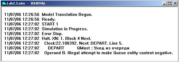 Однократное выполнение программы имитационной модели будем называть прогоном модели. Прогон начинается, когда система встречает управляющий оператор Start. Он может быть в тексте модели, а также его можно задать в интерактивном режиме командой Command/START. Появляется диалоговое окно, в котором следует уточнить значение счетчика завершений. В нашем примере моделирование должно завершаться с приходом транзакта-таймера, который уменьшает счетчик завершений на 1 (см. последнюю строку программы). Поэтому начальное значение счетчика завершений должно быть равно 1, т.е. команда начала моделирования имеет вид START 1. В ходе выполнения моделирования текущие сообщения выводятся в журнал и отражаются в строке состояния. В случае успешного окончания прогона модели, в Журнале указывается время окончания моделирования и сообщение о формировании отчета. Отчет о результатах моделирования формируется автоматически в окне REPORT (Отчет). Выполните команду START 1 и изучите сообщения в окне Журнала. Моделирование закончилось в 50 минут модельного времени (Clock is 50.000000). Это же время указано в окне REPORT (Отчет) в столбце END TIME. Повторные команды START (повторные прогоны) выполняются с текущего значения модельного времени. Учитывается также и накопленная статистика моделирования, т.е. моделирование продолжается с того состояния, в котором модель находилась в момент прекращения предыдущего прогона. Сбросить в 0 модельное время и статистику моделирования можно командой Command/CLEAR. Выполните еще раз команду START 1. Будет сформирован новый отчет, в котором значение END TIME равно 100 и статистика моделирования учитывает информацию, накопленную во время обоих прогонов. Теперь задайте команду Command/CLEAR выполните еще один прогон модели. Время окончания моделирования будет равно 50, т.е. моделирование было начато сначала (с нулевого момента времени, когда в системе не было еще ни одного транзакта). Иногда не требуется получать отчет о результатах моделирования при каждом прогоне модели. Подавить формирование отчета можно, если в команде START задать параметр NP (не формировать отчет): START 1,NP Обратите внимание, что между запятой и параметром NP не должно быть пробела! Содержимое окна JOURNAL (Журнал) можно сохранить в файле с расширением .sim. Если закрыть окно Журнала без сохранения его содержимого, то объект Имитация (т.е., откомпилированная программа модели) удаляется из памяти компьютера. Требуется вновь компиляция модели и запуск имитации на выполнение. Закройте без сохранения окно Журнала и все созданные ранее окна Отчетов. Рассмотрим пример ошибок, возникающих в ходе имитации. При проявлении любой такой ошибки моделирование аварийно прекращается. Внесите в текст программы следующие исправления: в блоке DEPART измените имя очереди на QMast. Выполните компиляцию модели. Такая ошибка не будет выявлена в процессе компиляции. Начните выполнение прогона модели командой START 1. Имитация будет остановлена, когда первый транзакт попытается войти в блок DEPART. Система выдаст сообщение, что зафиксирована попытка сделать содержимое очереди отрицательным (рис.2.6). Дело в том, что система считает, что имеется две разные очереди: QMaster и QMast. Транзакт был учтен, как поступивший в очередь QMaster (соответствующий счетчик количества транзактов в этой очереди был увеличен), а покинуть он пытается другую очередь – QMa