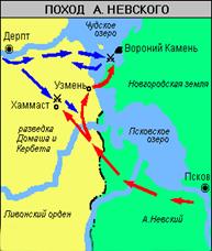 Летом 1240 года в Новгородскую землю вторглись немецкие рыцари из Ливонского ордена, созданного из орденов Меченосцев и Тевтонского. Еще в 1237 году римский папа Григорий IX благословил немецких рыцарей на завоевание коренных русских земель. Войско завоевателей состояло из немцев, медвежан, юрьевцев и датских рыцарей из Ревеля. С ними был предатель - русский князь Ярослав Владимирович. Они появились под стенами Изборска и взяли город штурмом. На помощь землякам бросились псковичи, но их ополчение потерпело поражение. Одних убитых было свыше 800 человек, в том числе воевода Гаврила Гориславич. Аппетит немцев возрастал. Они уже говорили: "Укорим словенский язык… себе", то есть подчиним себе русский народ. Зимой 1240-1241 года рыцари вновь явились непрошеными гостями в Новгородскую землю. На этот раз они захватили территорию племени водь (вожан), к востоку от реки Нарва, "повоеваша все и дань на них возложиша". Захватив "Водьскую пятину", рыцари овладели Тесовым (на реке Оредеж), и их разъезды появлялись в 35 км от Новгорода. Таким образом, в руках Ливонского ордена оказалась обширная территория в районе Изборск - Псков - Сабель - Тесов - Копорье. Немцы уже заранее считали пограничные русские земли своим достоянием; папа "передал" побережье Невы и Карелию под юрисдикцию эзельскому епископу, который заключил с рыцарями договор: себе выговорил десятую часть всего, что дает земля, а все прочее - рыбные ловли, покосы, пашни - предоставил рыцарям. Александр организовал войско из новгородцев, ладожан, карел и ижорцев. Прежде всего необходимо было решить вопрос о способе действий. В руках врага находились Псков и Копорье. Александр понимал, что одновременное выступление в двух направлениях распылит силы. Поэтому, определив копорское направление как приоритетное, - враг подходил к Новгороду, - князь решил нанести первый удар на Копорье, а затем уже освободить от захватчиков Псков. В 1241 году войско под командованием Александра выступило в поход, достигло Копорья, овладело крепостью "и изверже град из основание, а самих немец изби, а иных с собою приводе в Новгород, а иных пожалова отпусти, бе бо милостив паче меры, а вожан и чюдцев переветников (т.е. изменников) извеша (повесил)". Водьская пятина была очищена от немцев. Правый фланг и тыл новгородского войска были теперь в безопасности. В марте 1242 года новгородцы вновь выступили в поход и вскоре уже были под Псковом. Александр, считая, что для атаки сильной крепости у него сил недостаточно, ожидал своего брата Андрей Ярославича с суздальскими дружинами, которые вскоре и подошли. Орден не успел прислать подкрепление своим рыцарям. Псков был окружен, и рыцарский гарнизон взят в плен. Орденских наместников Александр отправил в оковах в Новгород. В бою было убито 70 знатных орденских братьев и много рядовых рыцарей. После этого поражения Орден стал сосредоточивать свои силы в пределах Дерптского епископства, подготавливая наступление против русских. Орден собрал большую силу: здесь были почти все его рыцари с магистром во главе, со всеми епископами, большое количество местных воинов, а также воины шведского короля. Александр решил перенести войну на территорию самого Ордена. Русская рать выступила на Изборск. Вперед князь Александр Невский выслал несколько разведывательных отрядов. Один из них, под командой брат