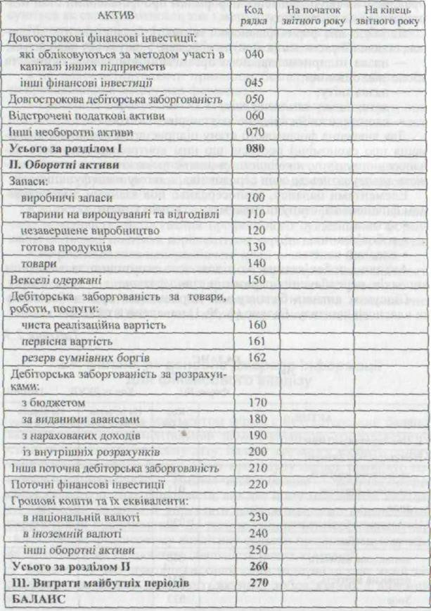 Основним звітним документом фірми є бухгалтерський баланс. який являє собою моментальний знімок фінансово-господарською стану підприємства на певну дату. Баланс дає змогу зробити оцінку найсуттєвіших ознак фірми. Саму процедуру оцінок прийнято називати читанням балансу. Вміння читати баланс — важлива професійна характеристика фінансиста, яка дає йому можливість складати прогнозні баланси й управляти найважливішими фінансовими параметрами підприємства. До того ж уміння читати фінансові звіти допомагає фінансовому аналітику скласти правильну думку про фінансовий стан і виробничу діяльність інших компаній. Баланс — звіт про фінансовий стан підприємства, який відображує на певну дату його активи, зобов'язання і власний капітал. Метою складання балансу є надання користувачам повної, правдивої та неупередженої інформації про фінансовий стан підприємства на звітну дату. Як і будь-яка форма фінансової звітності, баланс містить заголовок, основні її елементи (класи) та підкласи. У заголовку наводиться: —назва підприємства, його організаційно-правова форма та місце знаходження; —назва звіту; —дата, на яку складено звіт; —валюта, в якій складено звіт, та рівень її точності. Длявивчення фінансового стану підприємства необхідна інформація про економічні ресурси, що ним контролюються, його фінансову структуру, ліквідність та платоспроможність, а також здатнисть адаптуватись до змін середовища, в якому воно функціонує. Елементамибалансу, безпосередньо пов'язаними з визначенням фінансового стану підприємства та змін у ньому, є: • активи; • зобов'язання; • власний капітал. Активи і зобов'язання не підлягають згортанню за винятком випадків, передбачених окремими стандартами. Підсумок активів балансу має дорівнювати сумі зобов'язань та власного капіталу. Баланс (ф. № 1) наведено в табл. 2.3. Таблиця 2.3