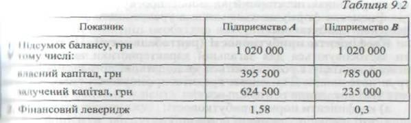 При цьому відомо, шо підприємства А і В мають різну фінансову структуру: підприємство А активно використовує позикові джерела, підприємство В, навпаки, віддає перевагу власним джерелам фінансових ресурсів. Структуру пасиву балансу цих підприємств наведено в табл. 9.2.