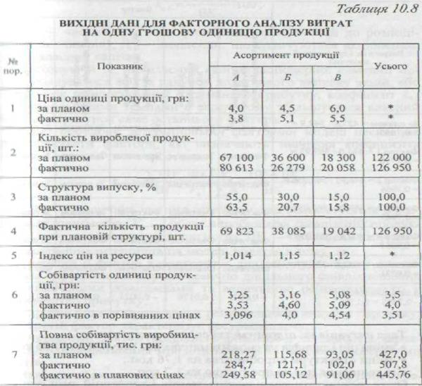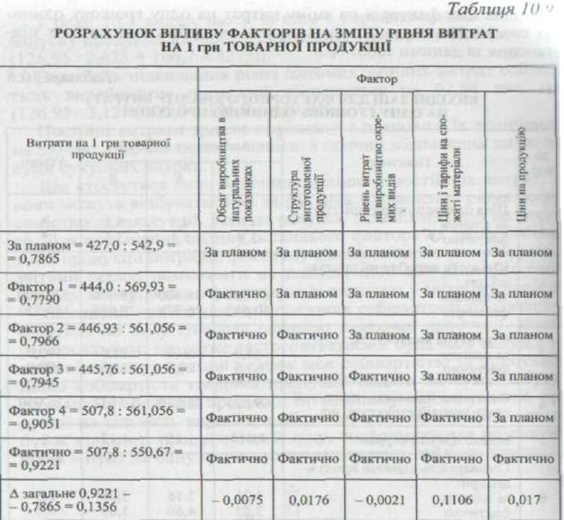 де qі — кількість виробів у натуральних одиницях виміру i-го виду товару; сi — собівартість одного виробу; рi — ціна продукції; n — кількість видів товару в номенклатурі. Безпосередній вплив на зміни рівня витрат на одну грошову одиницю продукції здійснюють п'ять факторів, які перебувають з ним у прямій функціональній залежності: 2003структура виготовленої продукції; 2004обсяг виробництва в натуральних показниках; 2005рівень витрат на виробництво окремих виробів; 2006ціни та тарифи на спожиті матеріальні ресурси; 2007ціни на продукцію. Вплив цих факторів на зміну витрат на одну грошову одицю товарної продукції розраховують способом ланцюгових підстановок за даними табл. 10.8.