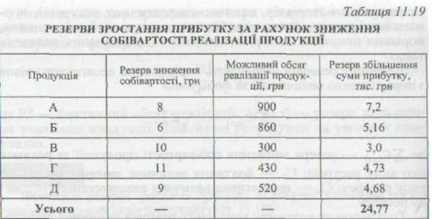 Дані табл. 11.20 показують, що у зв'язку із зростанням частки продукції І сорту до 60 %, її — до 40 %, зниженням випуску виробів III сорту середня ціна реалізації виробу збільшиться на 27,2 тис. грн. Після закінчення аналізу пошуку резервів збільшення прибутку результати його узагальнюються. Під час пошуку резервів прибутку протягом звітного року можуть раптово бути виявлені резерви короткострокової дії. Залучення цих резервів зростання прибутку можливе за допомогою розробки і реалізації системи оперативних заходів.