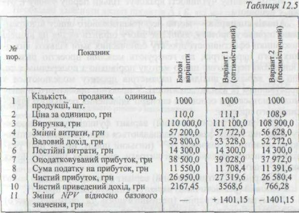 Отже, показник чутливості Кч чистого приведеного доходу до зміни ціни на один відсоток становить 58,73 %, тобто 1401,15 / 2167,45 *100 = 64,6%; Кч = 64.6 / 1.1 = 58.73 %. Так визначають показники чутливості по кожному фактору. Оскільки число сполучень значень факторів нескінченно велике, аналіз одночасної їх зміни виконують за допомогою комп'ютера; 5) на базі даних, отриманих за допомогою аналізу чутливості, встановлюють найважливіші з погляду інвестиційного ризику фактори, а також розробляють найбільш ефективну стратегію реалізації проекту. Хоча метод аналізу чутливості широко використовується завдяки своїй простоті, існують обмеження в його застосуванні. Це зумовлено тим, що відокремлений ризик проекту залежить від: чутливості NPVпроекту до змін основних факторів ризику; взаємозалежності цих факторів і можливості їх спільного впливу на проект. Метод аналізу чутливості враховує тільки першу умову і, отже, є неповним. Аналіз сценаріїв — метод неформалізованого опису відокремленого ризику проекту, який дає змогу оцінити вплив на кінцеві показники ефективності проекту одночасних змін кількох вихідних його параметрів, що генерують можливі проектні ризики. Основною перевагою цього методу порівняно з попереднім є те, що всі варіанти вихідних параметрів проекту моделюються з урахуванням їх взаємозалежності. У практиці проектного аналізу моделюються три основних сценарії здійснення реального інвестиційного проекту: 144)найгірший (песимістичний) варіант функціонування проекту, коли негативні фактори накладаються один на одного і спільно впливають на значення NPV(низький попит, низькі ціни реалізації, високі середні змінні витрати, зростання інвестиційних 145)найкращий (оптимістичний) варіант функціонування; • базовий (реалістичний) варіант функціонування проекту. Розглянемо кілька підходів щодо використання цього методу на практиці. Пертий підхід пов'язаний з коригуванням грошового потоку та наступним розрахунком NPVдля всіх варіантів. Методика аналізу в цьому випадку така: 94)по інвестиційному проекту моделюють три його можливих варіанти: песимістичний, найбільш імовірний (реалістичний), оптимістичний; 95)по кожному з варіантів розраховують відповідний NPV, тобто отримують три величини: NPVп; NPVр; NPVо; 96)розраховують розмах варіації NPV за формулою