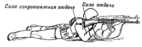 Величина начальной скорости пули зависит от длины ствола, массы пули, массы порохового заряда и от других факторов. Чем длиннее ствол (до известных пределов), тем дольше действуют на пулю пороховые газы и тем больше ее начальная скорость. Ввиду того что давление газов в канале ствола действует во все стороны с одинаковой силой, при выстреле оно не только выталкивает пулю вперед, но и отталкивает оружие назад. Движение оружия (ствола) назад во время выстрела называется отдачей. Отдача стрелкового оружия ощущается в виде толчка в плечо, руку или в грунт. Действие отдачи оружия характеризуется величиной скорости и энергии, которой оно обладает при движении назад. Скорость отдачи оружия примерно во столько раз меньше начальной скорости пули, во сколько раз пуля легче оружия. Энергия отдачи у автомата не превышает 2 кгс • м (19,6 Дж) и воспринимается стреляющими безболезненно. Сила давления пороховых газов (сила отдачи) и сила сопротивления отдаче (упор приклада, рукоятки, центр тяжести оружия и т. д.) расположены не на одной прямой и направлены в противоположные стороны. Они образуют пару сил, под действием которой дульная часть оружия отклоняется кверху (рис. 59). Отклонение тем больше, чем больше плечо этой пары сил. Кроме того, при выстреле ствол оружия совершает колебательные движения - вибрирует. В результате вибрации дульная часть ствола в момент вылета пули может также отклониться от первоначального положения в любую сторону (вверх, вниз, вправо, влево). Величина этого отклонения увеличивается при неправильном использовании упора для стрельбы, загрязнении оружия и т. п. Влияние вибрации ствола, отдача оружия и другие причины приводят к образованию угла между направлением оси канала ствола; до выстрела и ее направлением в момент вылета пули из канала ствола; этот угол называется углом вылета. Угол вылета считается положительным, когда ось канала ствола в момент вылета пули выше ее положения до выстрела, и отрицательным, когда она ниже. Для обеспечения однообразия угла вылета и уменьшения влияния отдачи на результаты стрельбы необходимо точно соблюдать приемы стрельбы и правила ухода за оружием.