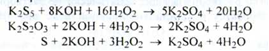 Спирт відганяють, розчин розбавляють водою, додають розчин водню пероксиду концентрований: Сумарно: Надлишок калію гідроксиду визначають ацидиметрією: