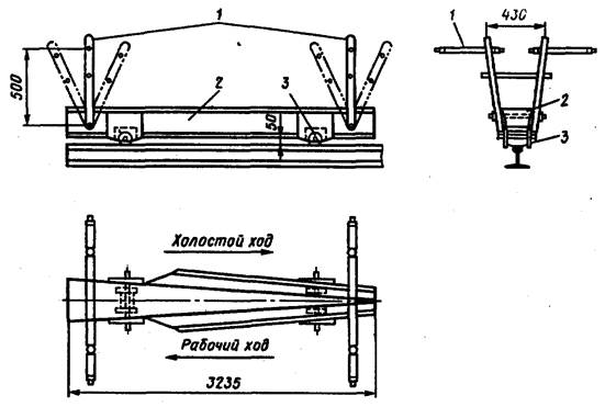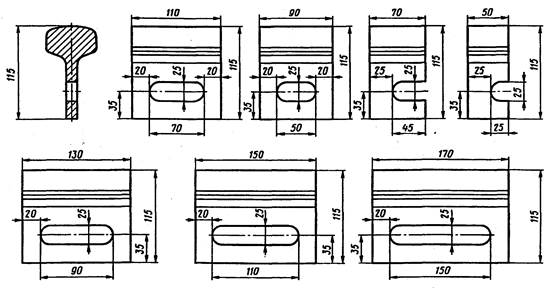 Разгонка зазоров. Подтверждением необходимости разгонки зазоров на конкретном участке служит максимальная величина разрыва рельсовой нити в стыках. В примере (табл. 2.9, рис. 2.42) он достигает 101 мм (стык № 15), что значительно превышает размер возможного конструктивного зазора. Из табл. 2.9 видно, что на отрезке пути до стыка № 45 накопление измеренных зазоров превышает сумму нормальных зазоров, что указывает на необходимость передвижки рельсов на этом участке в сторону начального стыка. На остальном отрезке пути накопление зазоров имеет знак минус, что означает изменение направления передвижки рельсов в сторону нарастания номера стыков. В 45-м стыке разрыва рельсовой колеи делать не требуется. Если линия накопления измеренных зазоров на графике поднимается круче линии накопления нормальных зазоров, то это означает, что на этом отрезке фактические зазоры больше нормальных, и, наоборот, если линия нормальных зазоров круче линии измеренных - фактические зазоры меньше нормальных. Горизонтальное расположение линии измеренных зазоров указывает на отсутствие зазоров в стыках на данном участке. Из графы 6 видно, что в данном случае длина сдвигаемой плети принята равной двум рельсам длиной по 25 м. Работы производятся в следующем порядке. В стыках, в которых разрывается рельсовая колея, типовые накладки заменяют на инвентарные с измененным расположением отверстий (рис. 2.43), срубают рельсовые соединители и устанавливают временные перемычки, обеспечивающие нормальную работу рельсовых цепей при оторванных соединителях; в этих же стыках снимают болты на одном из концов рельсов; в остальных стыках ослабляют болты. На однопутных линиях со стороны, противоположной направлению передвижки рельсов, от шпал отодвигают противоугоны, препятствующие сдвижке рельсов; в стыках устанавливают прозорники. Затем в первом стыке с инвентарными накладками устанавливают разгоночный прибор и производят передвижку рельсовой плети до тех пор, пока все прозорники со стороны, куда передвигаются рельсы, не окажутся зажатыми. При этом в стыке, где установлен прибор, образуется разрыв. После передвижки плети снимают прозорники, закрепляют болты, добивают противоугоны. При необходимости пропуска поезда по месту работ в стыке с разрывом колеи устанавливают вкладыш (рис. 2.44) и болтами скрепляют его с накладками. Разгонка зазоров может производиться как в "окна", так и в интервалы между поездами с ограждением места работ сигналами остановки; поезда пропускают со скоростью 25 км/ч при рельсах типа Р65, 15 км/ч - при рельсах типа Р50. Работами руководит дорожный мастер.