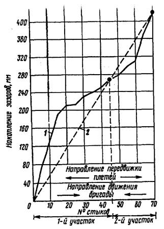 Регулировка зазоров. В табл. 2.8 приведена ведомость (образец) регулировки зазоров по одной из рельсовых нитей, а на рис. 2.40 - соответствующий ей график накопления зазоров (составленный по средним значениям зазоров на пикете).