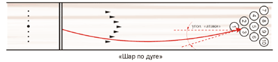 Средний результат при прямом броске - 50% СТРАЙКов. Если для Вас приемлем результат в 175-180 очков, Вы можете использовать лишь этот удар. Прямой бросок рекомендуется при выполнении SPARE, где он наиболее эффективен. Бросок по дуге (Шар по дуге) При этой технике шар движется к кеглям по дуге, за счет чего увеличивается угол атаки и улучшается результат. Положение пальцев на "часах" при броске - между 4 и 5. При этом, в момент освобождения шара необходимо сделать поворот пальцев против часовой стрелки. Интенсивность "поворота" пальцев определяет радиус дуги.