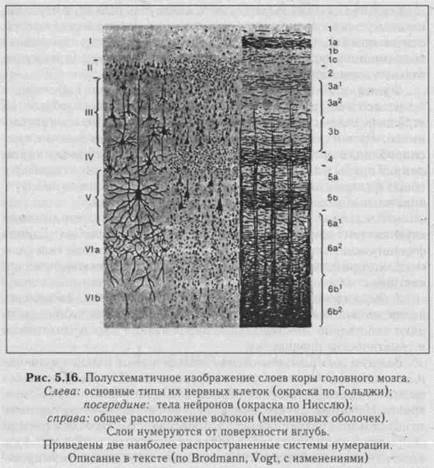 А. Структурно-функциональная организация коры. Кора большого мозга представляет собой многослойную нейронную ткань с множеством складок. В коре выделяют 6 слоев (I—VI), каждый из которых состоит из пирамидных и звездчатых клеток