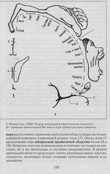 (рис. 5.16). Главная особенность пирамидных клеток (название отражает форму клеток) заключается в том, что их аксоны выходят из коры, а также оканчиваются в других корковых структурах. Название звездчатых клеток также обусловлено их формой; их аксоны оканчиваются в коре, т. е. речь идет о корковых интернейронах. ВI—IV слоях происходят восприятие и обработка поступающих в кору сигналов в виде импульсов. Покидающие кору эфферентные пути формируются преимущественно в У-У1 слоях. Деление коры на различные поля проведено К. Бродманом (1909) на основе цито-архитектонических признаков - формы и расположения нейронов. Автор выделил 52 поля, многие из них характеризуются функциональными и нейрохимическими особенностями. Кортикализация функций — возрастание в филогенезе роли коры большого мозга в анализе и регуляция функций организма и подчинение себе нижележащих отделов ЦНС. Выключение коры больших полушарий у обезьян и у человека приводит к потере не только локомоции, но и выпрямительных рефлексов, которые у других млекопитающих сохраняются. Б. Локализация функций в коре большого мозга. В определенных участках коры большого мозга сосредоточены нейроны, воспринимающие определенный вид раздражителя: свет - затылочная область, звук - височная доля и т.д. Двигательные функции также распределены на значительных площадях коры большого мозга, например, нейроны, аксоны которых формируют пирамидный тракт, расположены не только в моторных областях, но и за их пределами. В настоящее время принято подразделение коры на сенсорные, двигательные и ассоциативные (неспецифические) зоны. Сенсорные зоны коры — это зоны, в которые поступает сенсорная информация (от рецепторов): проекционная кора, корковые отделы анализаторов по И. П. Павлову. Эти зоны расположены преимущественно в теменной, височной и затылочной долях. Восходящие пути в сенсорную кору поступают преимущественно от релейных сенсорных ядер таламуса. Первичные сенсорные области - зоны сенсорной коры, раздражение или разрушение которых вызывает четкие и постоянные изменения чувствительности организма (ядра анализаторов по И. П. Павлову). Они состоят преимущественно из мономодальных нейронов и формируют ощущения одного качества (одной модальности). В первичных сенсорных зонах обычно имеется четкое пространственное (топографическое) представительство частей тела, их рецепторных полей. Вокруг первичных сенсорных зон находятся менее локализованные вторичные сенсорные зоны, нейроны которых отвечают на действие нескольких раздражителей, т.е. они полимодальны. Важнейшей сенсорной областью являются теменная кора постцентральной извилины и соответствующая ей часть парацент-ральной дольки на медиальной поверхности полушарий, которая обозначается как соматосенсорная область I. Здесь имеется проекция кожной чувствительности противоположной стороны тела от тактильных, болевых, температурных рецепторов, интероцептив-ной чувствительности и чувствительности опорнодвигательного аппарата - от мышечных, суставных, сухожильных рецепторов (рис. 5.17). Кроме соматосенсорной области I выделяют меньших размеров соматосенсорную область II, расположенную на границе