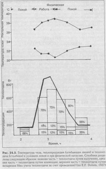 заключаются в обеспечении реагирования на изменение физических параметров раздражителей. Реакция организма на холод состоит в генерализованном сужении сосудов, которое помогает сохранять внутреннюю температуру, снижая утечку (выделение) тепла в периферические области тела. Характер адаптации к жаре у человека имеет свою специфику. Жара, особенно с высокой влажностью, является большей нагрузкой для спортсмена, чем холод. Когда температура среды выше температуры тела, тепло переходит из окружающей среды в организм. В таких случаях единственным способом отведения тепла служит испарение (потоотделение). В начале действия жары (высокой температуры) ректальная температура, потребление кислорода, частота сердечных сокращений и минутный объем быстро растут. Потоотделение невелико и недостаточно для сохранения постоянной температуры тела. Через 12 дней пребывания в жарком климате наступают очевидные признаки приспособления. Потоотделение удваивается, а частота сердечных сокращений и потребление кислорода падают примерно на 40%. Усиление испарения и понижение обмена веществ уменьшают повышение внутренней температуры. С более эффективной регуляцией связано сильное расширение сосудов, что повышает теплоотдачу на периферии и усиливает потоотделение (Р.О. ЗтигЫе, 1981). Адаптация у спортсменов наступает быстрее, если в первые 5-7 дней пребывания в зонах жаркого и влажного климата использовать баню (сауну) и прохладный (холодный) душ: перед сном прием прохладного душа и углеводистых напитков, а утром прием холодного душа и адаптогенов (лимонник, жень-шень, пантокрин и др.). Кроме того, достаточный прием напитков (чай, минеральная вода, соки и пр.) является одним из важных моментов ускорения адаптации. При несоблюдении принципов адаптации могут возникнуть различные осложнения - тепловой и солнечный удар и др.