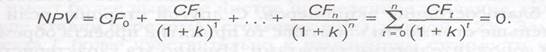 Ранее мы представляли процедуры для нахождения доходности облигаций до срока погашения. Совершенно те же понятия используются при составлении капитального бюджета, если применяется метод внутренней доходности (рентабельности, Internal Rate of Return, IRR). Внутренняя доходность определяется как ставка дисконтирования, уравнивающая приведенное значение ожидаемых входящих потоков проекта и приведенное значение его затрат;