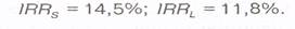 Таким образом, для нахождения !RR нам необходимо решить одно уравнение с одним неизвестным. В то время как нахождение чистого приведенного значения возможно и без помощи финансового калькулятора или электронной таблицы, это не так просто в отношении внутренней доходности проекта. К счастью, решить нашу задачу можно с помощью финансовой функции ВНДОХ электронной таблицы Exel. Ниже представлены значения внутренней доходности проектов S и L: