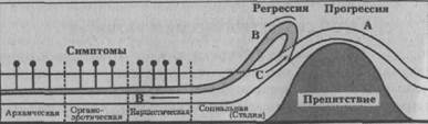 Рис. 1. Психоаналитическое представление регрессии. (Перепечатано с позволения издателей из Korzybski, Alfred: Science and Sanity An Introduction to Non-Aristotelian Systems and General Semantics, Lancaster, Pa. The International Non-Aristotelian Library Publishing Co., 1933.) Термин «регрессия» в психоанализе относится к большому ряду симптомов. Сам Фрейд использует термин «регрессия» главным образом для того, чтобы описать «возврат к первым объектам, наделенным либидо, которые, как мы знаем, являются инцестными по характеру, и возврат всей сексуальной организации к более ранним стадиям». В дополнение к «регрессии либидо» Фрейд говорит о «регрессии Эго» и «объект-регрессии». В другой психоаналитической и психологической литературе термин «регрессия» использовался более широко; например, любой вид ухода от реальности на уровень фантазии назывался регрессией. Сам Фрейд подчеркивал, что он использует термин «регрессия» как чисто описательное понятие, а не как динамическое понятие, подобное регрессии. Тем не менее он выдвинул определенные идеи о факторах, которые способствуют регрессии. Согласно ему, существуют два основных условия для регрессии: (1) фиксация либидо на объектах предшествующего состояния развития и (2) трудности в удовлетворении либидозных потребностей на более зрелом уровне. Часто в психоаналитической литературе развитие рассматривалось как равномерно прогрессирующее либидо, а регрессия — как поворот этого потока либидо назад после встречи препятствия. Диаграмма Корцибского представляет эту точку зрения (рис. 1). Мы хотели бы обсудить это представление более подробно с целью прояснения понятия регрессии. Необходимость такого концептуального уточнения подчеркивалась Фрейдом, и в уточнении, по-видимому, все еще есть необходимость. Проблемы развития и регрессии занимают свое место в науке как особая точка пересечения исторических и динамических проблем. Они указывают, с одной стороны, на уникальную последовательность переживаний, ситуаций, личностных структур и стилей поведения в течение истории индивида. С другой стороны, они указывают на динамику и законы, которые управляют поведением в любой из этих стадий и переходом от одной стадии к другой. Комбинация обоих типов проблем в рамках проблемы развития или регрессии абсолютно оправданна и необходима. Однако важно прояснить суть обеих проблем и их связи. Абрахам использует следующую таблицу, показывающую стадии либидинальной организации, стадии в развитии любви к объекту и доминирующую точку фиксации (Фенихель, 1934).