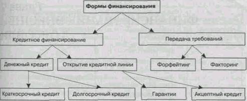 В основе такой сделки может лежать не только торговля потребительскими товарами, но и поставка машин и оборудования, продажа нематериального имущества (права, лицензии). Экспортное финансирование должно быть связано непосредственно с конкретным договором о поставке товаров и услуг, в котором урегулированы права, обязанности продавца (поставщика) и покупателя (подрядчика). При финансировании экспорта используются практически все формы кредитов, которые применяются для внутренней торговли. Образовались и особенные формы финансирования, которые находятся в тесной связи с предоставленными иностранному партнеру условиями платежа (рис1).