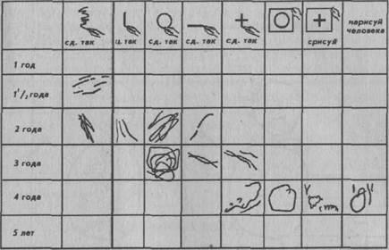 Рис. 2. Картина субнормальных достижений. ственное продвижение вперед. Так оно в действительности и есть, но, как покашвает графа возраста, все они даны с заметным запозданием. Рисунки эти полезно сравнить со стандартными достижениями (рис. 1). Если отвлечься от возрастного момента, то рисунки С. D. можно рассматривать как вполне нормальные. Все де>\о, однако, именно в том, что эти рисунки обнаруживают хронологический сдвиг, вскрывая таким образом систематическое психомоторное отставание. В 4 года рисунки С. D. едва достигают трехлетней ступени. Она может провести как вертикальную, так и горизонтальную черту, но не в состоянии образовать крест из этих двух линий. Она делает недурной круг, но «человечек» в ее изображении ни на что не похож. Она доступный, послушный, желающий понравиться и охотно рисующий ребенок — и тем не менее то, как она доканчивает ждорисованную фигуру,.убедительно доказывает ее субнорма-льноетъ. Экспериментатор показал ей незаконченный рисунок человека и сказал: «Вот видишь, дядя, который делал этого человека, нарисовал не все. Пририсуй то, чего здесь нет. Сделай так, чтобы получился настоящий хороший человек». CD. реагировала на