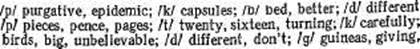 /b/ goes /p/ pieces, repaired, purpose; ft! tears, take, turned; /b/ been, big, bed, back, both; /d/ idea, decided, didn't, day; /g/ get, guessed, girls, going /p/ picture, period, expect, pair; til fifteen, instead, artist; /k/ keep, basket, vacation, campus; /b/ be, beside, embarrassing; la/ study, depths, days, Daddy; /g/ giggle, gets, girls, go /p/ pink, experience, penny, pale; /t/ tin, wanted, take-, turned; /k/ drinking, came, candid, curly; /b/ been, beacon, bit, bad, Burton; /d/ condition, nodded, idea; /g/ give, get, girls /p/ especially, pattern; /t/ still, potatoes, tulip; /k/ keep, occasional, can, occupy; /b/ be, sugar-beet, backbone; /d/ Dee, deer, muddy, dirt; /g/ gives, longest, regular /p/ appealing, paid, pupils, perfect; /t/ teach, stick, Tuesday, tears; /k/ keep, looking, carriage, cold; /b/ be, obeyed, back, boat; /d/ indeed, dinner, duly, date; /g/ given, guessed, again, ago /p/ planning, pit, repaid, passenger; /t/ stiff, city, grotesque, turns; /k/ keep, breaking, carriage, cold; /b/ being, best, back, Burlow; /d/ deal, ditties, dear, dead; /g/ getting, gave, go. *7. Transcribe these words. Say how the /p, t, k; b, d, g/ sounds are represented in spelling. Point out the letters which represent the mute sounds IP, t, k; b, d, g/. happy, hiccough, cupboard, pneumonia, lamb, plumber, bomb, Thomas, Christmas, listen, whistle, bouquet, handkerchief, Windsor, chemist, anchor, banquet, except, muscle, ghost, gnaw, sign, tongue, diaphragm, sigh, plough, eight Occlusive Nasal Sonor ants /m, n, rj/ In the /m, n, g/ phonemes only the second principle of classification is different. /m/ is labial, bilabial: the lips are slightly pressed together, forming a complete obstruction.