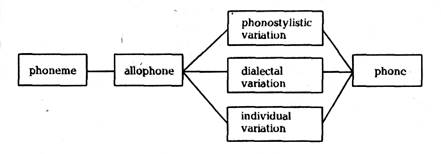[d] is pronounced without any plosion before another stop,.e.g. bedtime, bad pain, good dog; it is pronounced with the nasal plosion before the nasal sonorants [n] and [m], e.g. sudden, admit, could not, could meet; the plosion is lateral before the lateral sonorant [1], e.g. middle, badly, bad light. The alveolar position is particularly sensitive to the influence of the place of articulation of a following consonant. Thus followed by [r] the consonant [d] becomes post-alveolar, e.g. dry, dream; followed by the interdental [9], [9] it becomes dental, e.g. breadth, lead the way, good thing When [d] is followed by the labial [w] it becomes labialized, e.g. dweller. In the initial position [d] is partially devoiced, e.g. dog, dean; in the intervocalic position or when followed by a sonorant it is fully voiced, e.g. order, leader, driver; in the word-final position it is voiceless, e.g. road, raised, old. These modifications of the phoneme [d] are quite sufficient to demonstrate the articulatory difference between its allophones, though the list of them could be easily extended. If you consider the production of the allophones of the phoneme above you will find that they possess three articulatory features in common, all of them are forelingual lenis stops. Consequently, though allophones of the same phoneme possess similar articulatory features they may frequently show considerable phonetic differences. It is perfectly obvious that in teaching English pronunciation the difference between the allophones of the same phoneme should be necessarily considered. The starting point is of course the articulation of the principal allophone, e.g. /d-d-d/: door, double, daughter, dark, etc. Special training of the subsidiary allophones should be provided too. Not all the subsidiary allophones are generally paid equal attention to. In teaching the pronunciation of [d], for instance, it is hardly necessary to concentrate on an allophone such as [d] before a front vowel as in Russian similar consonants in this position are also palatalized. Neither is it necessary to practise specially the labialized [d] after the labial [w] because in this position [d] cannot be pronounced in any other way. Carefully made up exercises will exclude the danger of foreign accent. Allophones are arranged into functionally similar groups, that is groups of sounds in which the members of each group are not opposed to one another, but are opposable to members of any other group to distinguish meanings in otherwise similar se-qucences. Consequently allophones of the same phoneme never occur in similar phonetic contexts, they are entirely predictable according to the phonetic environment, and thus carry no useful information, that is they cannot differentiate meanings. But the phones which are realized in speech do not correspond exactly to the allophone predicted by this or that phonetic environmenit. They are modified by phonostylistic, dialectal and individual factors. In fact, no speech sounds are absolutely alike. Phonemes are important for distinguishing meanings, for knowing whether, for instance, the message was take it or tape it. But there is more to speaker — listener exchange than just the "message" itself. The listener may pick up a variety of information about the speaker: about the locality he lives in, regional origin, his social status, age and even emotional state (angry, tired, excited), and much other information. Most of this other social information comes not from phonemic distinctions, but from phonetic ones. Thus, while phonemic evidence is important for lexical and grammatical meaning, most other aspects of a communication are conveyed by more subtle differences of speech sounds, requiring more detailed description at the phonetic level. There is more to a speech act than just the meaning of the words. The relationship's between the phoneme and the phone (speech sound) may be illustrated by the following scheme: