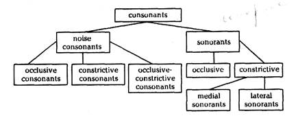 Another point of view is shared by a group of Soviet phoneticians (authors of the book among them). They suggest that the first and basic principle of classification should be the degree of noise. Such consideration leads to dividing English consonants into two general kinds: A — noise consonants В — sonorants It is easy to see that the term "degree of noise" belongs to auditory level of analysis. But it is hardly necessary to point out that there is an intrinsic connection between articulatory and auditory aspect of describing speech sounds, such that sometimes it is impossible to account for the former except in terms of the latter. In the above-mentioned case it is the term of auditory level that defines the characteristic more adequately. Talking about sonorants it is necessary to mention that they are consonants that phoneticians have traditionally a lot of argument about. The point is that sonorants are sounds that differ greatly from all other consonants of the language. This is largely due to the fact that in their production the air passage between the two organs of speech is fairly wide, that is much wider than in the production of noise consonants. As a result, the auditory effect is tone, not noise. This peculiarity of articulation makes sonorants sound more like vowels than consonants. On this ground some of the British phoneticians refer some of these consonants to the class of semivowels, [r], [j], [w], for example. Acoustically sonorants are opposed to all other consonants because they are characterized by sharply defined formant structure and the total energy of most of them is very high. However, on functional grounds, according to their position in the syllable, [j] [j], [w] are included in the consonantal category, but from the point of view of their phonetic description they are more perfectly treated as vowel glides. According to the Soviet phoneticians sonorants are considered to be consonants from articulatory, acoustic and phonological point of view and can be classified according to all the principles of classification of consonants. Looking back on the problem of providing an accurate criterion for estimating classificatory value of various properties displayed by sounds we may say that the great articulatory and acoustic difference of noise consonants and sonorants could be very well relied upon in this respect. The phonological relevance of this factor (the degree of noise) could be proved by the following oppositions: [beik — meik] bake — make (noise consonant — sonorant) [vi:l — wi:l] veal — wheel (noise consonant — sonorant) The following scheme may illustrate the point of view shared by the authors of this book: